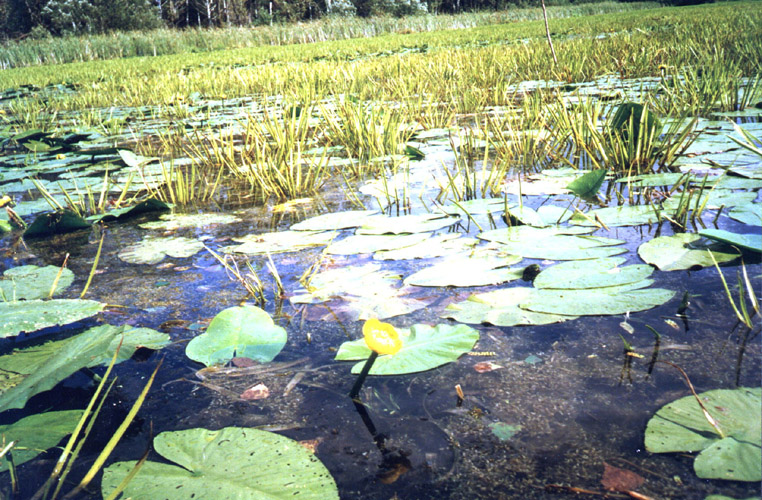 Заросли кубышки желтой Nuphar lutea (L.) Smith и телореза алоэвидного Stratiotes aloides L. на оз. Старица в окр. с. Усть-Чем (Новосибирская обл., Искитимский район).