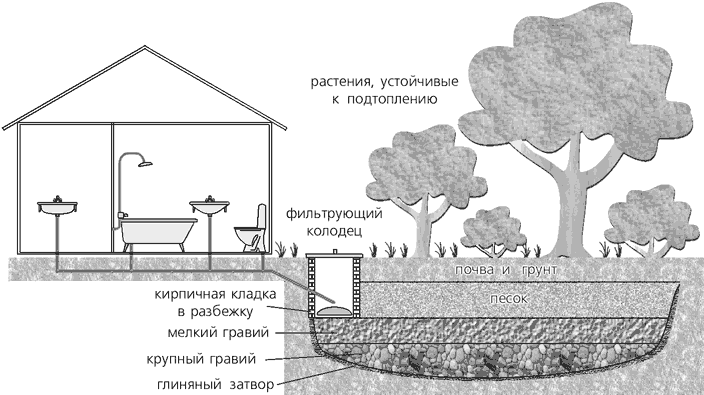 Простейшая система утилизации всех типов стоков осуществляется в специальной подземной емкости достаточного объема. Система представляет собой гидроизолированный (дно и стенки) котлован на приусадебном участке, заполненный гравием и песком. Сверху он засыпан грунтом, аналогично любой другой дренажной системе, в которую сливаются все стоки. В грунт над этой дренажной зоной высаживается растительность, способная за вегетационный период выкачать из него воду. Эта система используется для слива только зимой. Летом стоки отводятся в почвенные фильтры, которые будут описаны ниже. Чтобы система не забивалась, стоки предварительно направляются в отстойник для отделения грубой фракции.