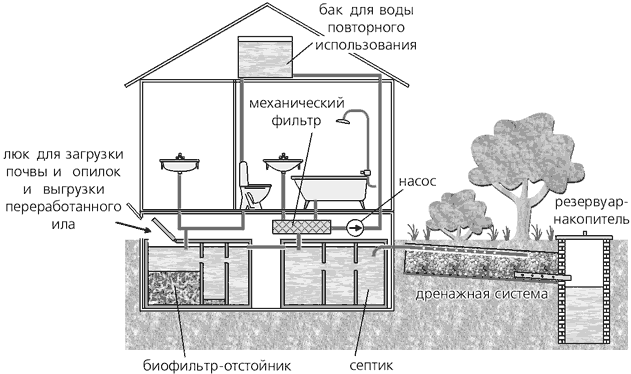 В отличие от системы с безводным компостирующим биотуалетом, здесь применяется смывной туалет с малым расходом воды. Слив из туалета осуществляется в биофильтр-отстойник, где оседает и подвергается переработке большая часть органических частиц. Сюда же попадают пищевые отходы с кухни. Один раз в 2-3 года биофильтр нужно чистить от переработанного ила. Ил перемешивается с компостом и вносится в почву под непищевые культуры. (Биофильтр -отстойник можно заменить фильтрующей камерой со сменными контейнерами (см. п. 11.3.), но чистят ее чаще.) Еще одним дополнением системы является то, что стоки из ванной, душа пропускаются через механический песчаный фильтр и направляются в бачок смывного унитаза для повторного использования.