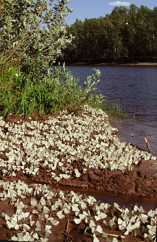 This is the most abundant and omnipresent (and, besides, most simply coloured) butterfly almost everywhere in the forest zone and woody mountains of South Siberia. Almost every year these butterflies appear in immense quantities and fly throughout June, forming incredible congregations on wet ground and swarming at flowering plants. I also often observed these butterflies flying, separately from each other, not in swarms, in the same direction for days but don't know the reason for it. Their main foodplant is the bird cherry (Padus avium), and also Spiraea media, Crataegus sanguinea and other arboreal Rosaceae, in Yakutia, Amurland and Transbaikalia also Vaccinium uliginosum. The larvae live gregareously; they hibernate on silken winter nests on the foodplant branches. Being so abundant, they often almost defoliate small bird cherry trees, the pupae densely covering thick branches at 1-3 m above the ground. As it was first discovered by a well-known explorer of Siberian butterflies Y.P. Korshunov, these butterflies copulate only when they are teneral, just having hatched from the pupae, which are placed usually close to each other. However, mature individuals perform some misterious pseudocopulations, when a pair acquire a very expressive, if not saying antropomorphic, posture with the female widely spreading wings and lifting the abdomen, while male sits above it, moves the wing vigorously and hits the female's abdomen with its own. No genitalia contact is observed, the butterflies looking as if doing this just for pleasure! Most probably, this is a sort of abortive sexual behaviour. Often numerous pseudo-copulating pairs are seen together. Thanks to such an expressive behaviour, many females loose most scales from their fore wings which appear almost transparent and look dark. Besides, hind wings of these butterflies are often brightly coloured (red or yellow) with flower pollen. There are very few fruit trees in Siberia and, besides, they are not suffer from this species, which almost does not seem to cause any substantial harm even for adult trees of its main foodplant bird cherry. But almost all local population traditionally beleive these are large whites (Pieris brassice, in Russian "kapustnitsa", i.e. "a cabbager") which eat their cabbage. In fact P. brassice penetrated into West Siberia only about 35 (first recorded by the same Y.P. Korshunov) and become abundant about 20 years ago, the cabbage suffering mostly from Pieris rapae.